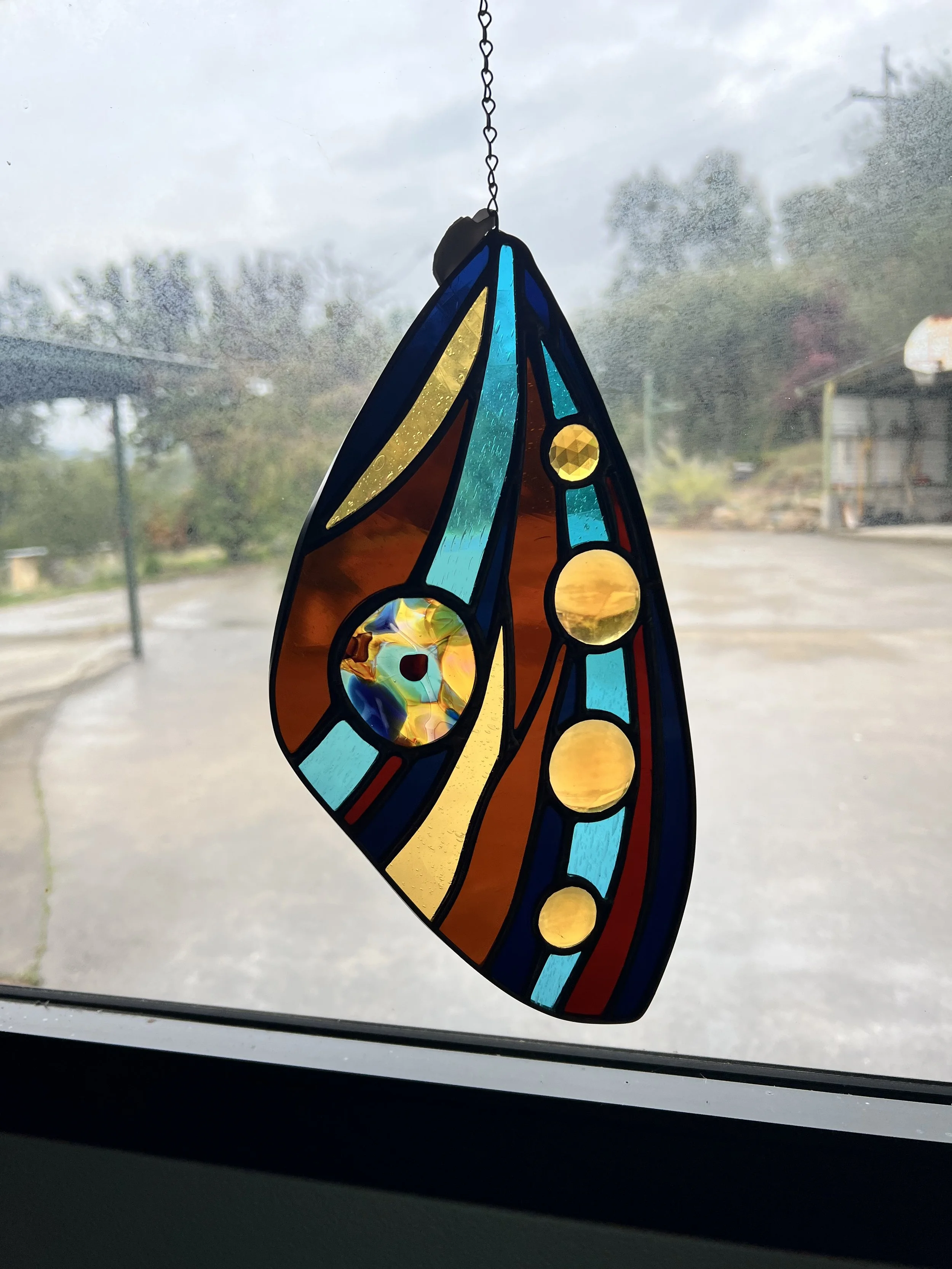 Gift horse is an intricately detailed panel incorporating a wide variety of glass and techniques. Details include copper foil overlay and hand engraved flash glass.