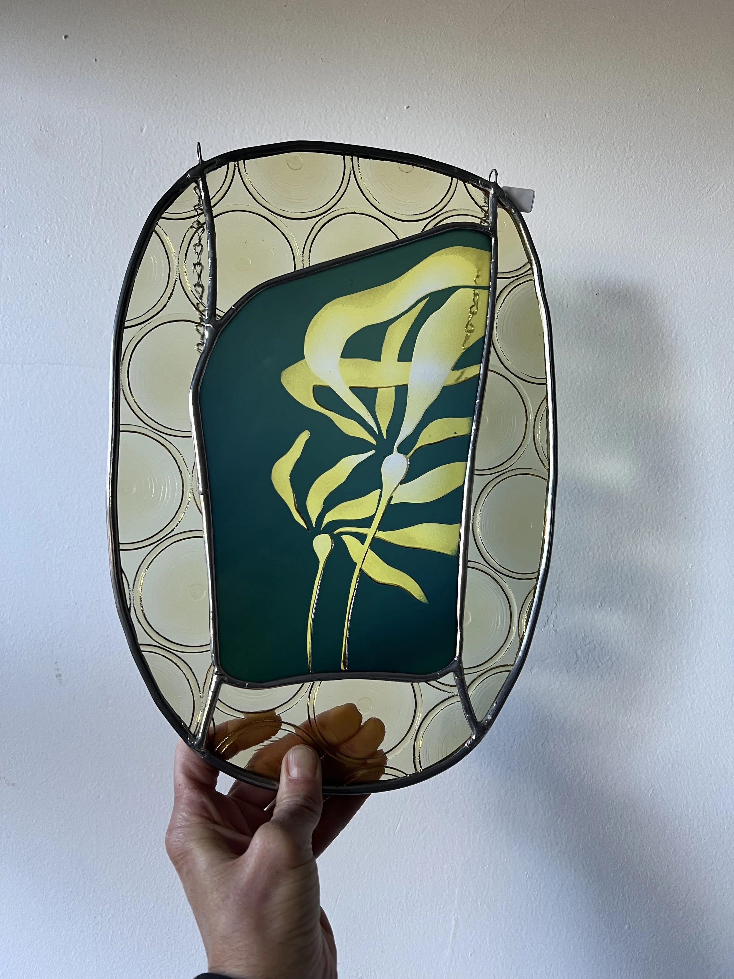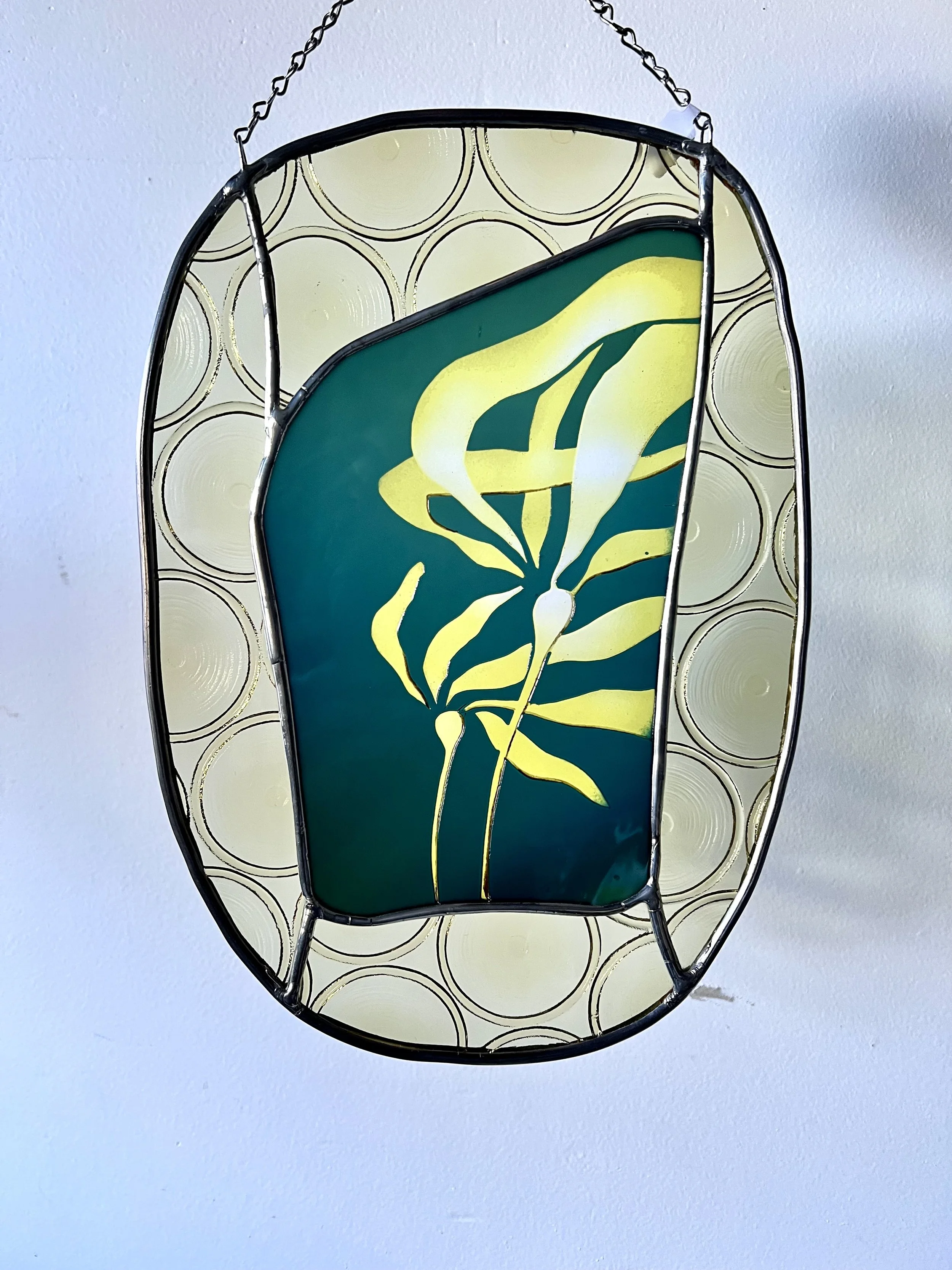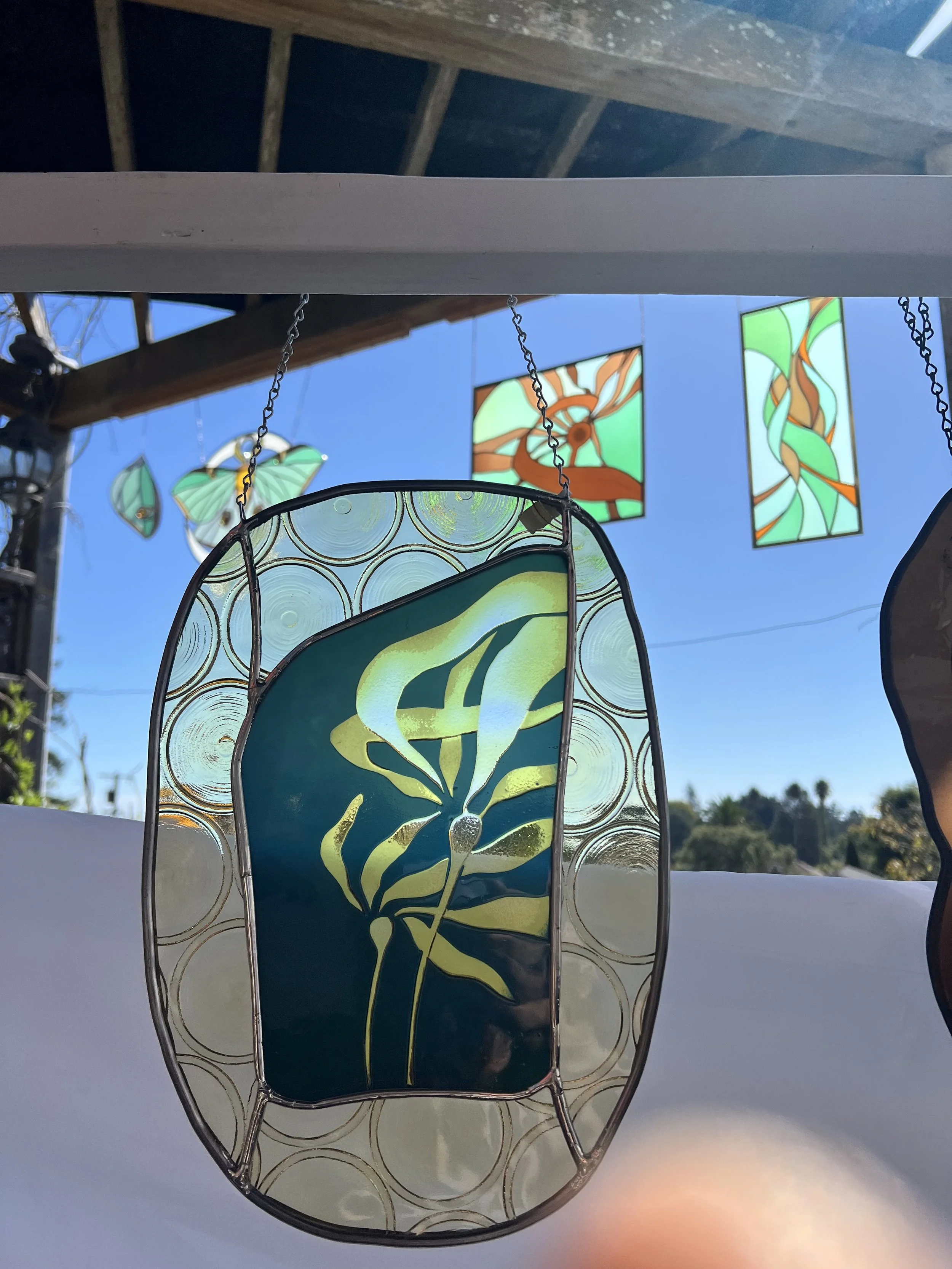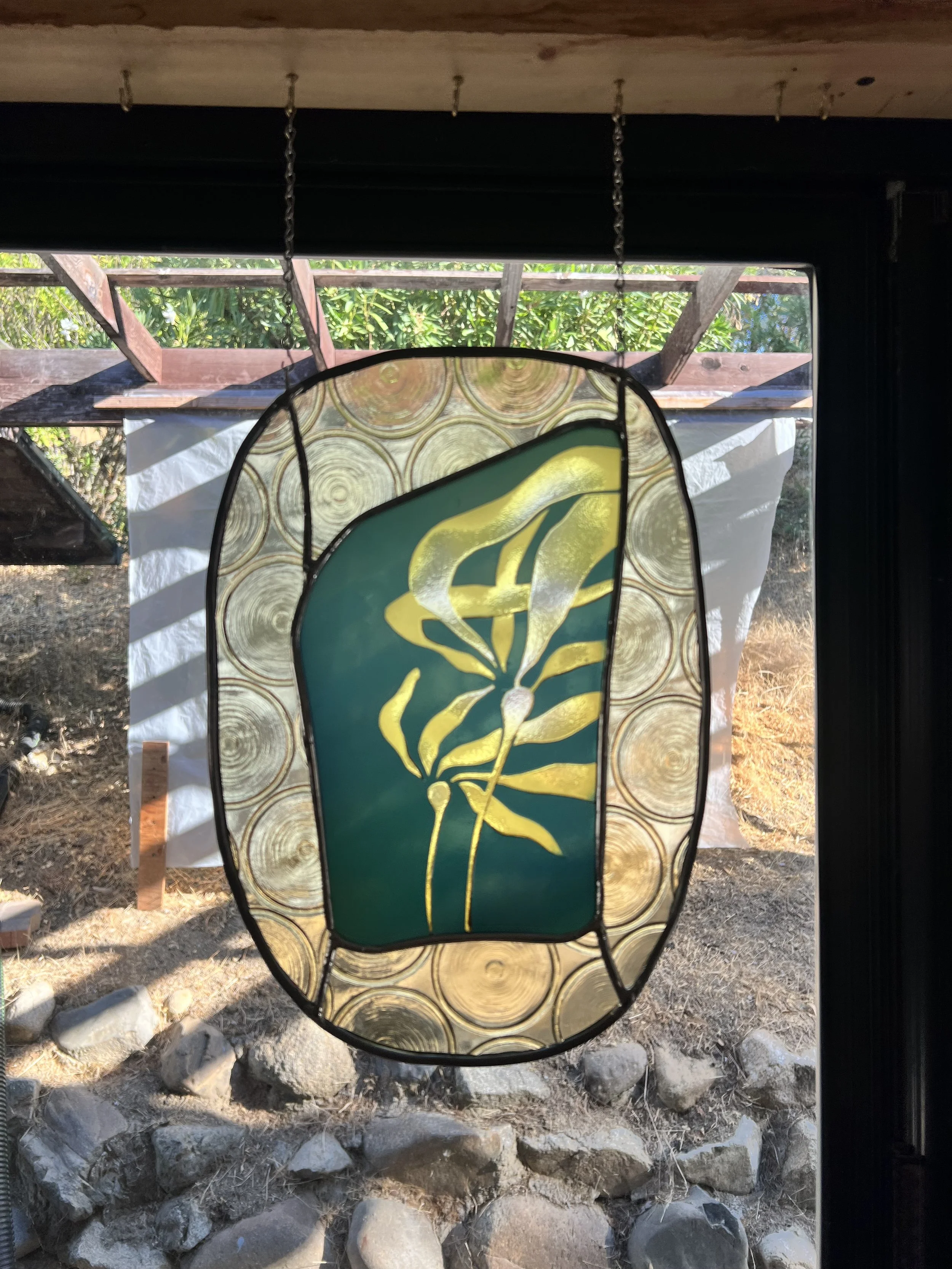 High in the Wasatch Range above Salt Lake City Utah is the peak of Mount Superior. Adored by skiers and hikers it is white in winter and red in summer. Ethereal white Fremont glass makes the mountain with a spectacular piece of mouth blown glass for the sky. The framing aspen trees are hand carved and soldered copper - giving three dimensional texture to the autumn leaves.